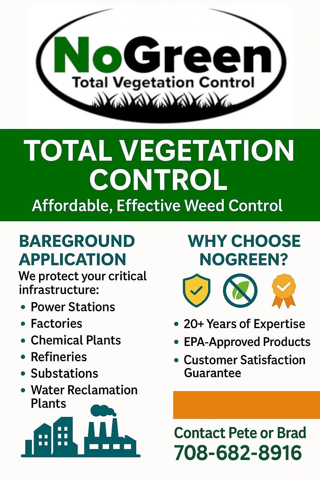 At NoGreen, we’re passionate about creating healthier, cleaner, and more sustainable landscapes. Founded with a commitment to total vegetation control, we specialize in providing environmentally responsible solutions for homeowners, businesses, and municipalities. With 15+ years of experience in the industry, we understand the delicate balance between effective vegetation management and maintaining the integrity of your environment.